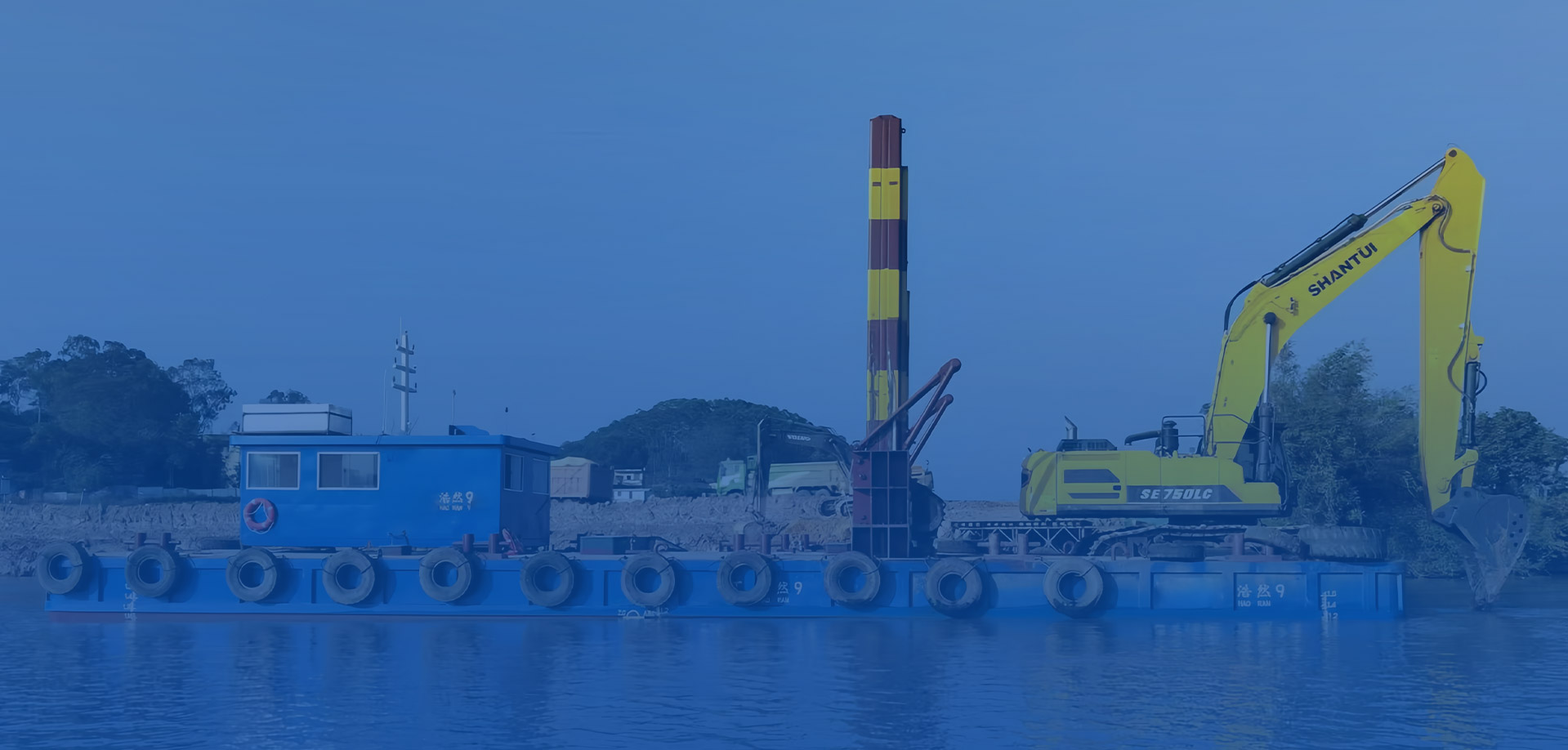 2、施工平臺穩(wěn)性強,方便挖掘機在深水區(qū)施工作業(yè)。并且,平臺自帶航行動力,便于水上調遣。